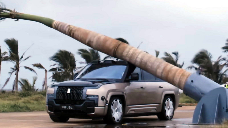 Yangwang U8 je aktuálně prezentován jako nejtužší SUV, jaké kdy vzniklo nejen v Číně, ale možná i na světě. Demonstrováno to bylo opakovaným pádem snadno pětitunové palmy na střechu, přičemž vozu šly po testu nejen otevřít dveře, ale dokázal i odjet po vlastní ose. Pokud přitom nedošlo na žádné přikrášlení, je třeba před Číňany smeknout. Foto: BYD