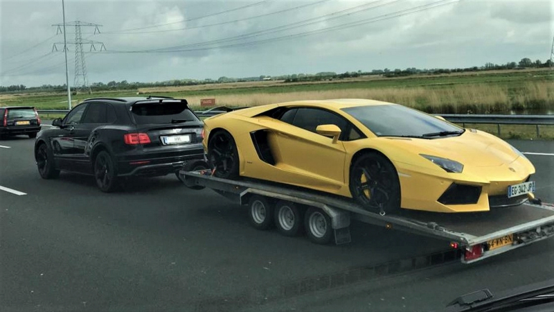 Někdo si umí zařídit život. To se pak může stát, že francouzské Lamborghini jede na holandském přívěsu taženém belgickým Bentley. K dokonalosti chybí málo.