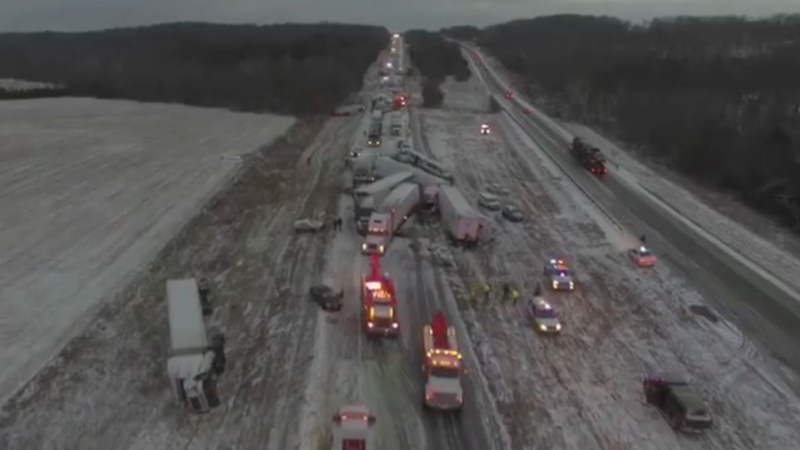 Ta největší se stala na dálnici Interstate 44 a došlo k ní poblíž městečka Marshfield. Na jedné hromadě tam skončila stovka aut. Incident si bohužel nevyžádal pouze poškození vozů či lehká zranění motoristů, ale také dvě úmrtí (za víkend pak v důsledku sněhové vánice jen na této dálnici zemřelo pět lidí). Je přitom zázrak, že následky nebyly větší, neboť letecký pohled na hromadnou havárii odhaluje její hrozivost.