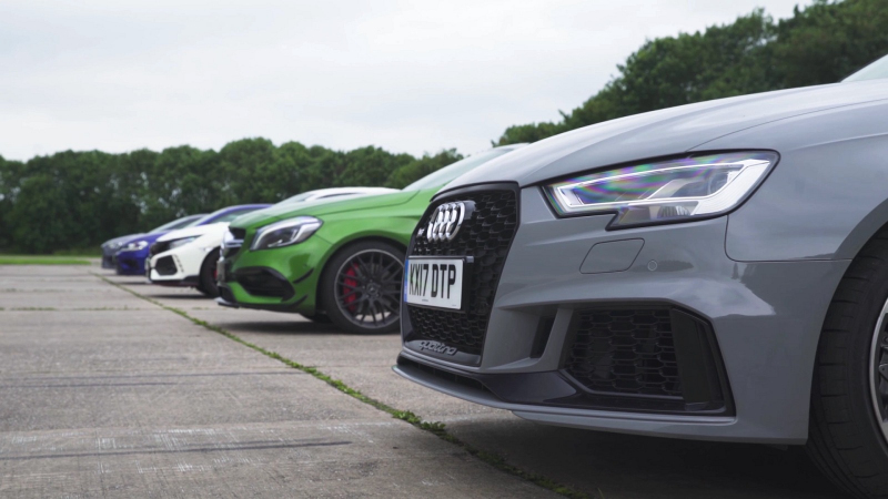 Právě s touto výbavou se RS3 nově vydalo na souboj nejen s Mercedesem-AMG A 45, ale také s novou Hondou Civic Type-R, faceliftovaným Volkswagenem Golf R a Fordem Focus RS. I přes vysoký výkon této trojice bylo ovšem jasné, že jde spíše o statisty, kteří mohou maximálně tak překvapit přiblížením se k druhému místu. Za outsidera lze brát CTR jako jedinou předokolku ve srovnání.