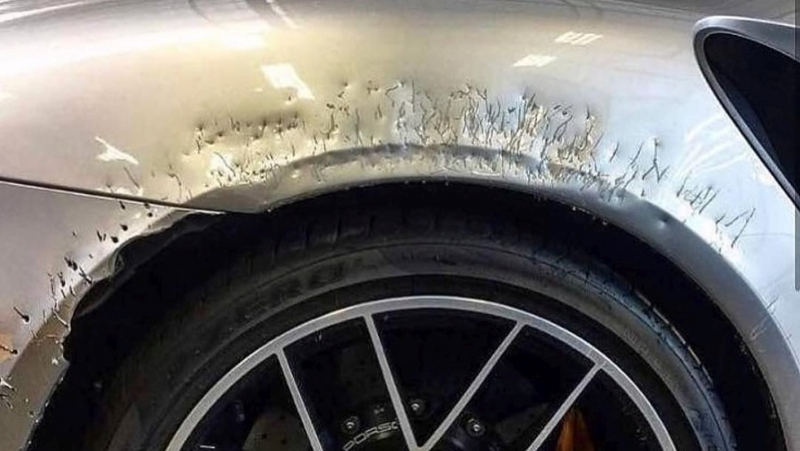 Pes rozkousal Porsche 911 Turbo S. Drahá hračka utrpěla zásah na pravém boku a slouží jako nejlepší důkaz toho, že nechat psy volně pobíhat kolem zaparkovaných aut není úplně dobrý nápad