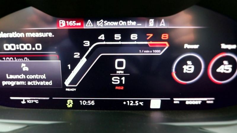 Audi uvádí v katalogu čtyřlitrový osmiválec twin-turbo s mikorohybrdní asistencí elektrické sítě. Strojovna nabízí až 600 koní (592 kW) výkonu a 800 Nm točivého momentu, jež přenáší osmistupňová automatická převodovka na všechna kola. Papírové zrychlení zabere 3,6 sekundy, ovšem americké měření ukázalo ještě úžasnější fakta. Reálná zkouška proběhla s dvěma lidmi na palubě a měřič s napojením na signál GPS zaznamenal 3,48 sekundy. To je hodnota lepší než u vrcholného provedení sporťáku ze stejné stáje, Audi R8 V10 Plus.