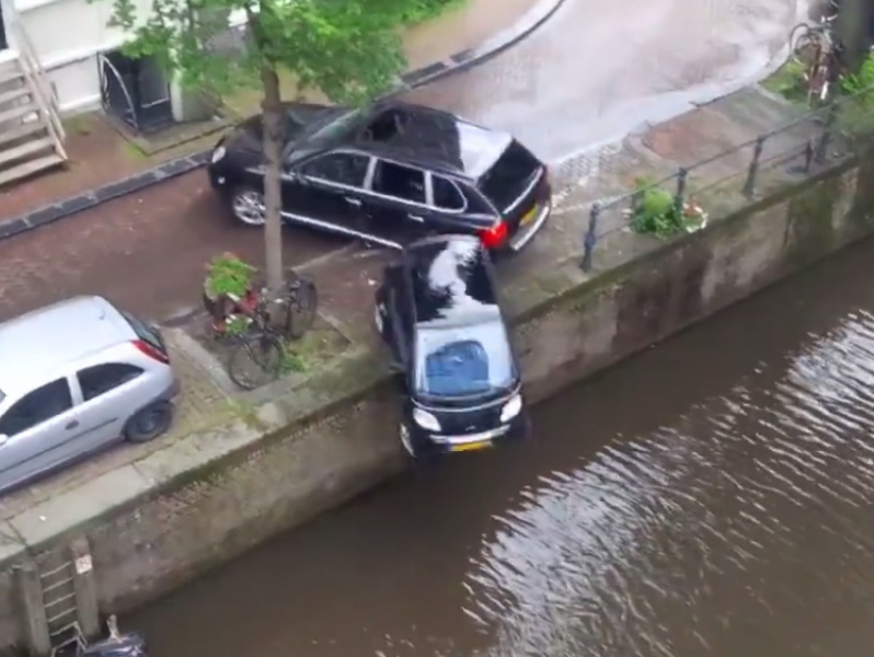 Ovšem důvod zastavení Porsche není obyčejný - na mokré vozovce dostalo smyk a zádí šouplo Smart do kanálu, úplně snadno, jako kulečníkovou kouli do díry. Člověka napadne, že jeho majitel nebude rád, zejména když řidič Porsche rychle mizí - po dalším kontaktu s dřevěným zábradlím. A ostatní auta ho následují, také zjevně nevzrušena tím, že nevinný Smart dostal nedobrovolnou koupel.