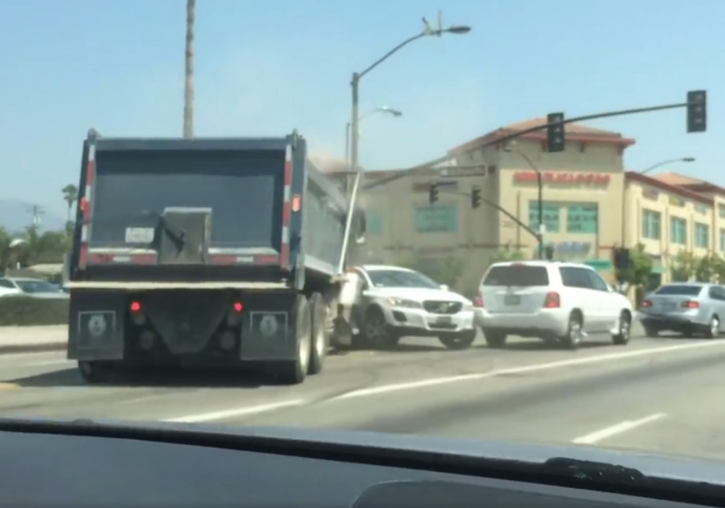 Vše se stalo ve městě San Gabriel v Kalifornii, kde neovládaný nákladní vůz postupně naboural osm aut a zranil přitom čtyři lidi. Incident byl natočen na video posádkou jiného auta, která náklaďák sledovala. Ten napřed šněroval silnici, pak narazil do bílého sedanu, jehož záď zdemoloval. O kousek dál ho zastavila fronta aut, čekajících na červenou. Dost kinetické energie, aby odstrčil čtyři auta stojící na brzdách, neměl, i tak jich většinu silně zdemoloval.