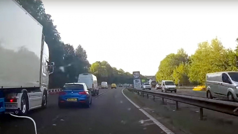 Vše začalo ještě před dopravním omezením, když si řidič Fordu Focus jel svým tempem v úplně krajním, tedy levém pruhu (jsme v Británii). Pomalý jezdec ve Fordu uviděl práci na silnici a zřejmě sundal nohu z plynu. Řidič kamionu jej proto chtěl předjet, do prostředního pruhu ale v tu samou chvíli mířil pilot modrého BMW 1. De iure měl přednost kamioňák (znovu, jsme na silnici, kde se jezdí vlevo), řidič bavoráku ho ale prostě neviděl a do prostředního pruhu vjel v úplně stejný moment. Trucker tak musel reagovat úhybným manévrem vlevo, aby nedošlo k nehodě a zvládl to. Jistě nepříjemná situace, ale takové věci se prostě stávají. Byla to jen chyba, přehlédnutí, nedorozumění, žádný zlý úmysl.