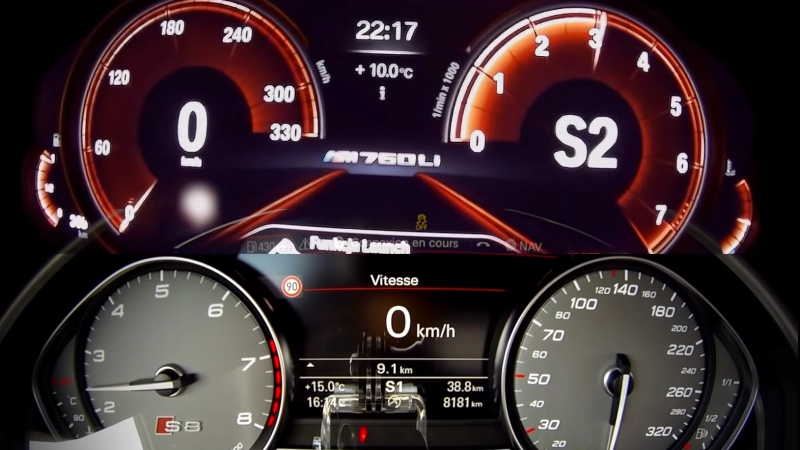 V případě mnichovské limuzíny je možné počítat s přeplňovaným 6,6litrovým dvanáctiválcem, jenž na všechna čtyři kola posílá 610 koní a 800 Nm. Audi oproti tomu působí na první pohled jako chudý příbuzný, k dispozici totiž má „pouze“ čtyřlitrový osmiválec biturbo, 605 koní a 750 Nm. Teoreticky by tedy při sprintu nemělo mít šanci, nicméně opak je pravdou po stránce teoretické i v praxi.