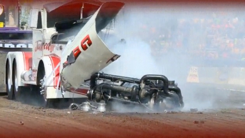 Z motoru se neutrhla jen hlava. Blok motoru praskl pod vrtáním válců a tlak ve spalovacích komorách vystřelil všechno kromě klikové hřídele, pístů s ojnicemi a klikové skříně skrz kapotu do vzduchu. Že něco takového nebude opravitelné, se můžete vsadit, tenhle truck bude potřebovat kromě opravy karoserie také zcela nový motor. Ovšem, teď je ve světě asi slavnější, než kdyby vyhrál všechny závody sezóny...