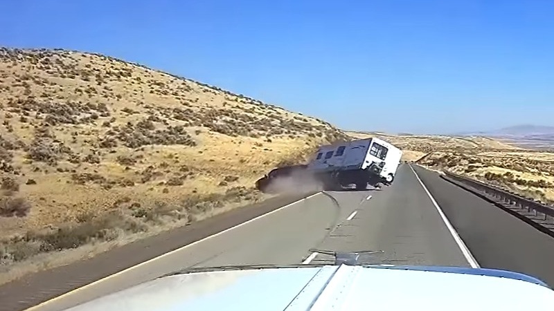 Už když je přívěs na úrovni tahače, vidíme jej kmitat. Postupně se kmitání zvětšuje, až se pravá kola nadzvednou z asfaltu - a pak přívěs pošle celou soupravu mimo vozovku. Trucker zastavil, nehodu ohlásil rádiem či telefonem a vylezl, aby lidem z Excursionu pomohl. Video je natáčeno palubní kamerou, která zabírá prostor před vozem, takže nevidíme, co se dělo u nehody. Prý ale ke zranění nedošlo, díky bohu.