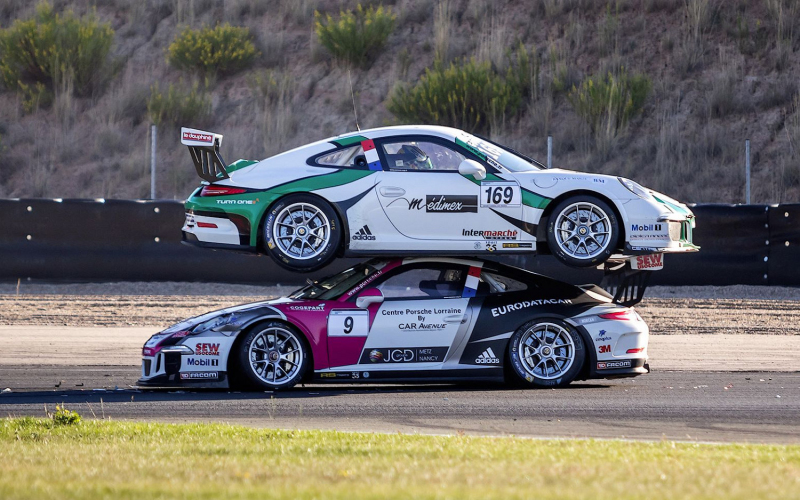 Tohle je nejbizarnější nehoda v dějinách, jedno Porsche 911 skončilo na střeše jiného (video)
