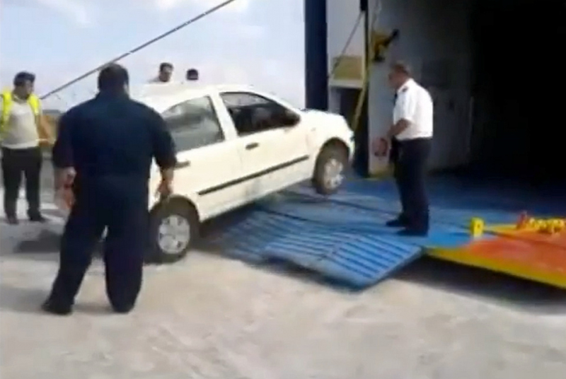 Trajekt na rozbouřeném moři se neklidně zmítá u břehu, přesto posádka nechá najíždět vozy na nájezd, který se vznáší tu pár desítek centimetrů, tu snad metr nad zemí. Za takových podmínek se najíždět na trajekt prostě nedá, ale Řekové to vidí jinak - aby posádka lodi všemu „pomohla”, zatíží nájezd vlastními těly (což je pochopitelně úplně k ničemu) a samotnou spojnici lodě s pevninou obloží snad nějakou vypelichanou kožkou. Ne proto, aby nájezd byl hladký, ale aby auta byla zmítající se palubou při nájezdu nabrána zespodu co nejméně.