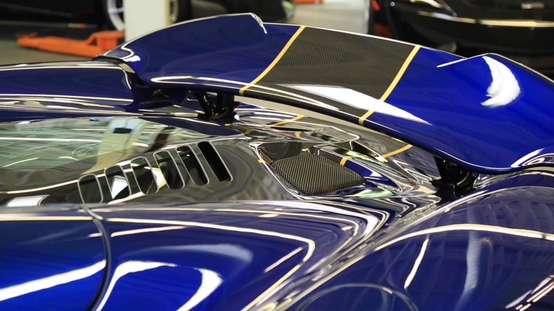 Za těchto jedenáct a půl milionu si majitel tohoto vozu objednal modrý karbon na části auta, pár zlatých detailů a logo „Electroform”, které je vyrobené z tenkého plátku stříbra, vloženého mezi jednotlivé vrstvy bezbarvého laku na pruhu obyčejného šedého karbonu, vedeného středem karoserie (sic). Vypadá tedy, jako by levitovalo, ale když přejedete prstem, necítíte žádnou nerovnost. Je to úžasný detail, ale jen jeho přesně neznámá cena musela být obrovská.