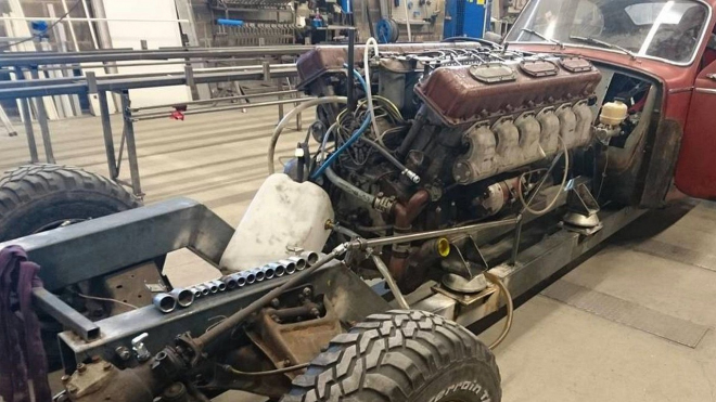 Jelikož dvanáctiválec je mnohem větších rozměrů než původní jedna-šestka, musel Viktor vytvořit zcela nové šasí. To má nyní na délku šest metrů a vpředu i vzadu používá komponenty vycházející z picku-upu GMC Sierra. Zároveň letité Volvo dostalo zakázkové planetové zpřevodování, které redukuje onen enormní točivý moment na cca 600 - 700 Nm při 6 000 ot./min na vstupu do převodovky.