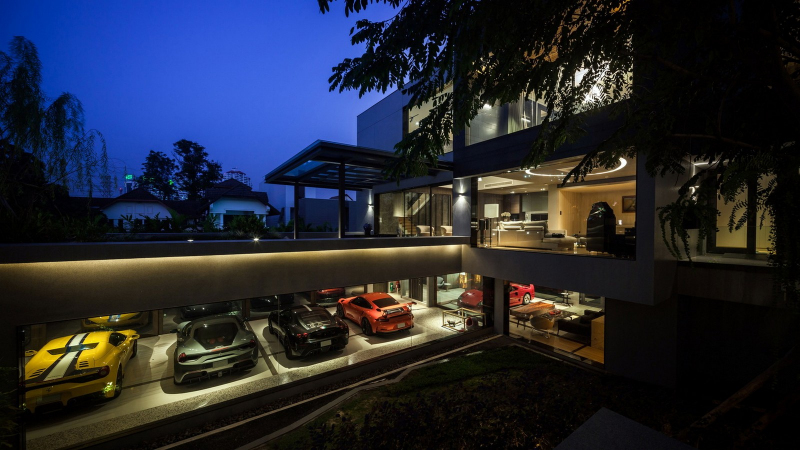 Od předního vchodu vede klesající cesta do jedné z hlavních dominant celého konceptu - do garáže, která zároveň slouží jako galerie superaut. Výstavní parkoviště pojme 5 kusů výjimečných exemplářů a ten nejcennější má místo v navazující místnosti jako symbolický král ve svém separé. Útulná klubovna pro všechny fanoušky spáleného benzínu slouží zároveň jako místo pro vítání návštěv a zábavní salonek s minibarem. Proskleným obloukem ve stropě prosvítá světlo z obývacího pokoje hlavního domu.