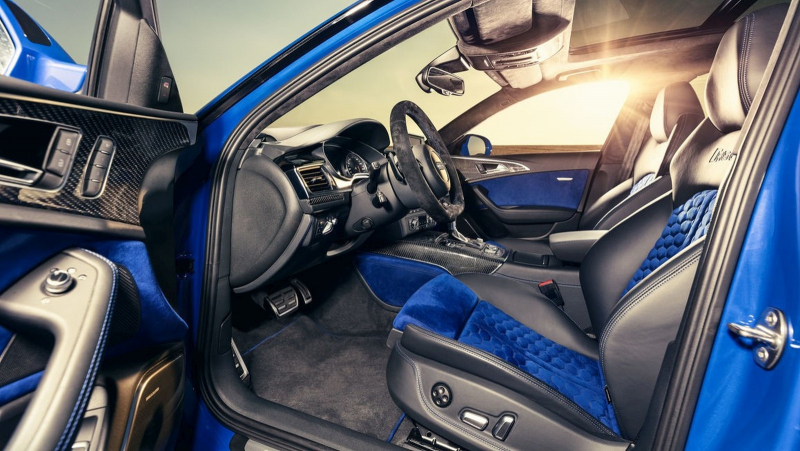 Modrá barva zvýrazňuje také luxusně pojatý interiér. Dveřní panely, střed sedaček a okraj středového tunelu jsou čalouněny modrou Alcantarou. Líce sedadel jsou pokryty kvalitní kůží Valcona, okraj volantu je vyveden v černém semiši. Modré kontrastní švy a lemování textilních koberců doplňují všudypřítomnou modř. Kromě námořnické barvy najdeme v interiéru také spoustu černé. Ozdobné karbonové kryty nesou logo RS6, nápis Nogaro Edition a číslo označující vyrobený kus ze série. Zájemci o klidnější vnitřní charakter mohou vybrat černý balíček Nogaro Edition. Modré díly nahradí černý odstín, modré zůstanou jen kontrastní švy a voštinové prošívání sedadel.