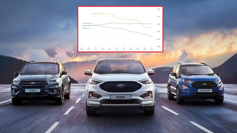 Tuto skutečnost stratégové obou velkých amerických automobilek přehlíželi s tím, že móda SUV je nyní natolik silná, že lidé zapomenou na sedany či hatchbacky, stejně jako kdysi zapomněli na koně. Nicméně realita je o trochu jiná a modrému oválu i GM se sázka na jednu kartu začíná nevyplácet. Ukazuje se, že někteří zákazníci po SUV prostě netouží. A když jim auta, která preferují, neprodá jimi po léta preferovaná značka, jednoduše zamíří jinam.