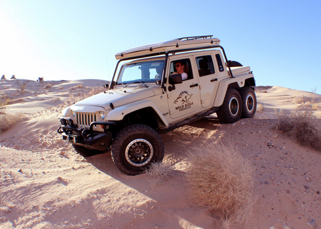 Že se offroady nemusí omezovat jen na čtyři kola, dokazuje poslední dobou až překvapivě hodně strojů, ať pocházejí z Ruska, z Velké Británie či z Německa. Také Američané přispěli, a to po svém - šest kol dostala jedna z ikon USA 20. století, Jeep Wrangler. A k tomu má korbu jako pick-up a může být vybaven 6,1litrovou V8 Hemi o výkonu 450 koní. Může to být ještě více americké?