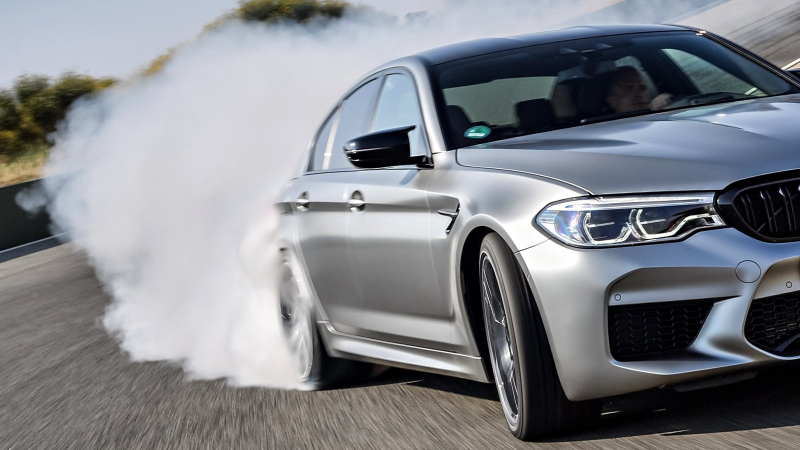 BMW M5 Competition disponuje kromě 625 koní také specifickým systémem xDrive, který umožňuje volbu mezi pohonem zadních a všech čtyř kol. Jak přitom ověřil Jonathan Benson z Tyre Reviews, s druhým režimem jste rychlejší a přitom nemusíte přijít o veškerou zábavu. Foto: BMW