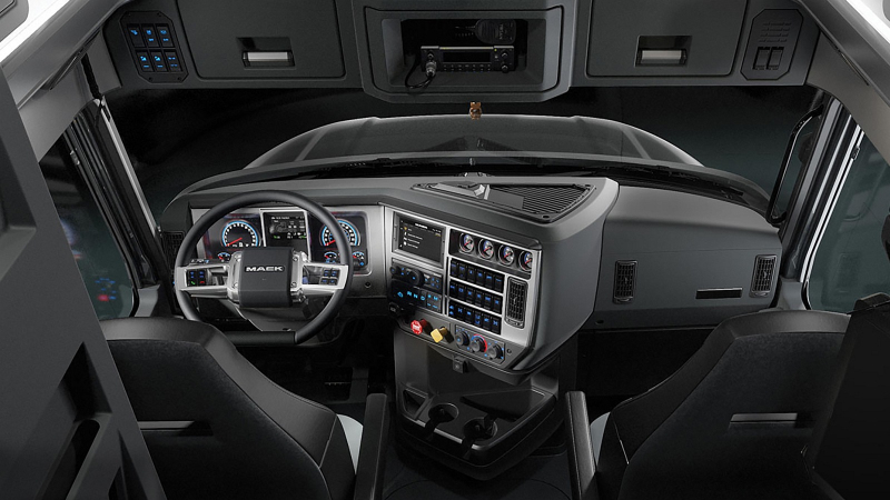 Na středový panel je možné přiobjednat ještě čtyři další budíky, které vidíme snad na všech fotkách níže. Vyberete-li si robotizovaný manuál Mack mDrive, jeho tlačítkový volič byl přesunut blíže k rukám řidiče. Podle toho, jestli je ve výbavě infotainment s navigací a Apple CarPlay, je volič umístěn na horní nebo dolní straně středového panelu.