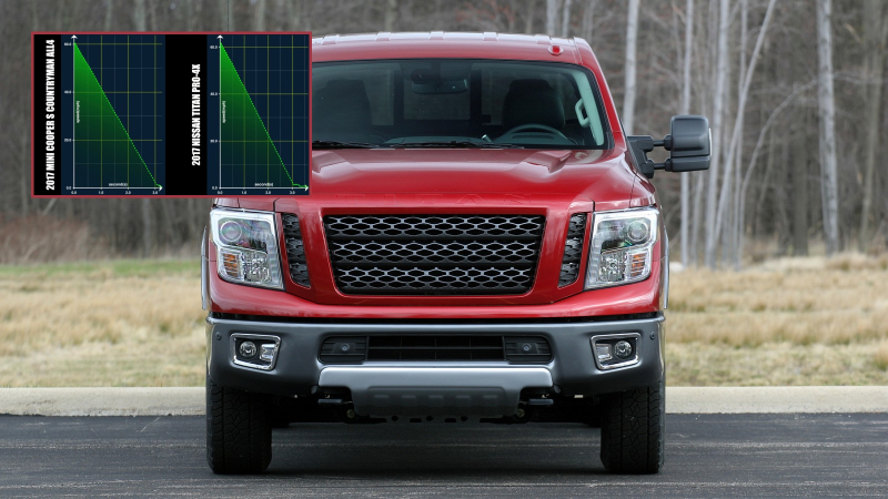 Jedním z nejzajímavějších zjištění při tomto měření bylo, že Nissan Titan Pro 4X brzdí lépe než Mini Cooper Countryman - ze stovky zastaví o 37 cm dříve. Byla by to zanedbatelná odchylka u srovnatelných aut, jenže Titan váží 2 636 kg a Mini 1 646 kg. To je rozdíl přesně 990 kg, skoto 1 tuna. Nebo jinak - Titan je o 60 % těžší než Mini.