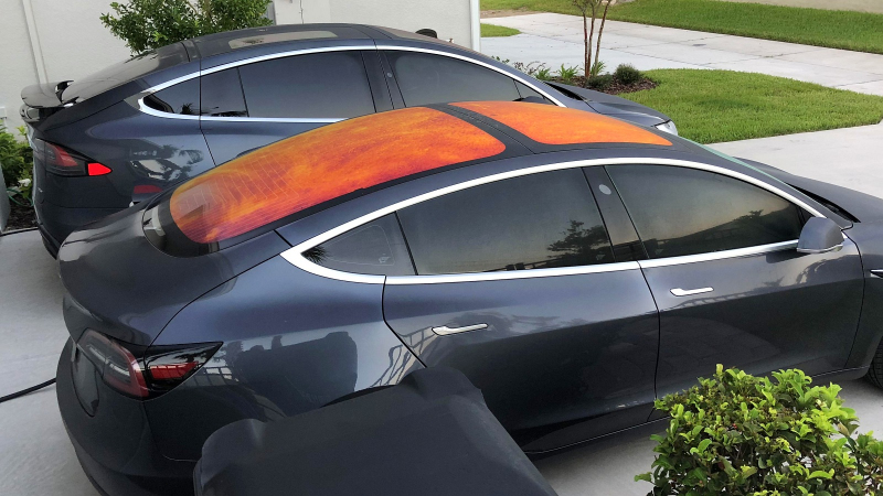 Zabarvení je možné pozorovat u aut vybavených panoramatickou střechou. Kabina u nich připomíná skleník, což by při slunečných dnech způsobovalo přehřívání a kladlo vysoké nároky na klimatizaci. Proto bylo u těchto střech zapotřebí použít speciální materiály. Oranžovou barvu způsobuje změna vlastností vrstvy nacházející se mezi skleněnými panely, která v neprůhledném módu odráží velkou část viditelného spektra včetně blízké infračervené oblasti. Nejde přitom o pokovení, které známe z jiných aut. S tímto řešením by byl narušen příjem signálu mobilního telefonu a GPS, což by u zrovna u Tesel způsobovalo zásadní problémy s fungováním.
