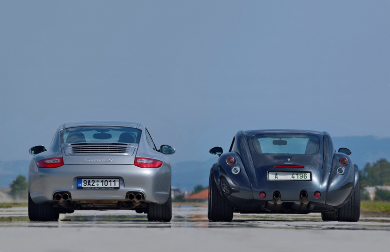 Tihle němečtí kluci si umí o zájem říci, i když stojí zaparkovaní před restaurací, a vůbec se nesnaží skrýt odlišnou koncepci svého pohonu. Porsche 911 Carrera S je klasik a jeho siluetu snad pozná každý, i to že v široké zadní části vozu se ukrývá ležatý motor s protiběžnými válci. To Wiesmann GT MF4 hlásá světu svou exkluzivitu retroprvky a krásnými oblými liniemi, které začínají na přední dlouhé kapotě a končí na víku zadních výklopných dveřích. Většina lidí však asi ani netuší jaký výkonový a jízdní potenciál v sobě tento vůz ukrývá, ale o tom až později.