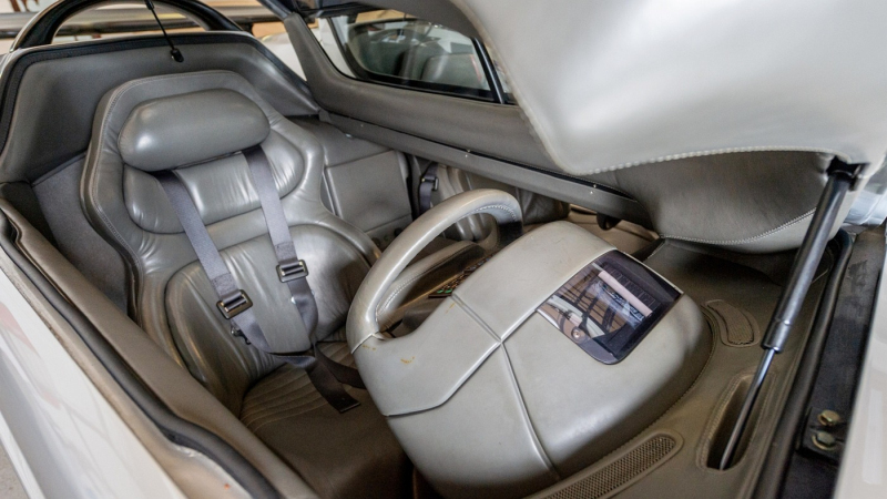 Uvnitř futuristického díla to vypadalo na dva volanty, ale pod věncem vpravo byly zobrazeny provozní informace a výstřední vůz se ovládal pouze z místa řidiče na levé straně. Dovnitř se nastupovalo klasickými dveřmi po zvednutí vyklopeného prosklení jako ze starých závodních aut. Průhledné boule nad kabinou se otevíraly vzhůru včetně elektrických zpětných zrcátek.