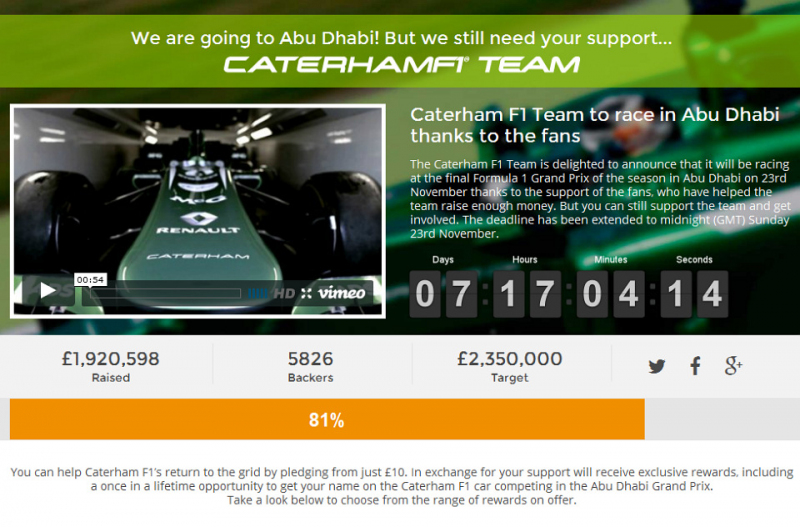 Minulý týden jsme vás informovali o snaze krachujícího formulového týmu Caterham vybrat od lidu peníze na účast v posledním závodě sezóny v Abú Dhabí. Pro stáj je to jediná možnost, jak ještě vůbec usilovat o právo startovat v příští sezóně - Caterham byl nucen už dva závody vynechat a pokud by nepřijel ani na ten poslední, přišel by o svou pozici ve startovním poli.