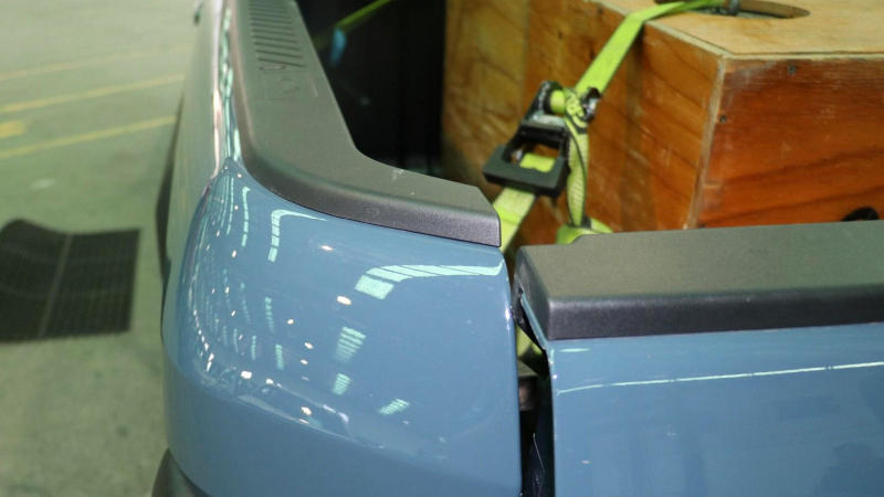 Kolegové, s jejichž laskavým svolením vám následky můžeme přiblížit i obrazem, ale při svých testech nezacházejí až do takových krajností, místo toho korby pick-upů zatěžují dvěma identickými kvádry, z nichž každý váží 325 kg. Mluvíme tu tedy o 650kilové zátěži, která je vždy ukotvena s pomocí sériových háčků a oček, jimiž jsou korby vybaveny. A přesně tak probíhal i test Tasmanu, u nějž kolegové zažili něco, co nikdy předtím. Po „přikurtování“ nákladu se totiž bočnice korby zhroutily natolik, že se zavření zadního víka stalo prakticky nemožným. A zadní partie se začaly rozpadat do takové míry, že jedna jejich část odírala druhou.