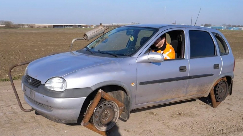 Odvážné obutí padlo na starý Opel Corsa a blázen v oranžovém kabátu se opravdu pokusil rozjet. Zprvu se mohlo zdát, že to nemůže dopadnout dobře, Milo ale šlápl na plyn a rozjel Corsu i s hranatými koly. Malý hatchback vážně nabral směr, jen za sebou nechal hluboké rýhy od navařených trubek. Řidič se chvílemi bouchal do hlavy o strop, protože na špičatých kolech to pořádně drncalo.
