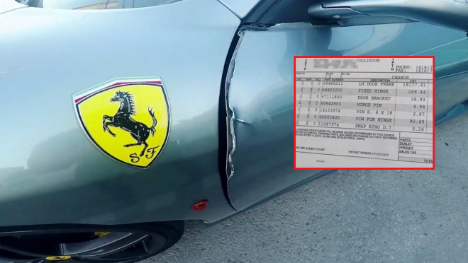 Nebyl by to takový problém, pokud by byla oprava kryta z povinného ručení vozu, který do onoho Ferrari narazil. Jenže on narazil do otevřených dveří a v Kanadě je údajně v takovém případě 100% odpovědný řidič vozu, jehož otevřené dveře to byly. Jestli účet zaplatilo havarijní pojištění, či vůbec jestli ho měl majitel sjednané, nevíme.