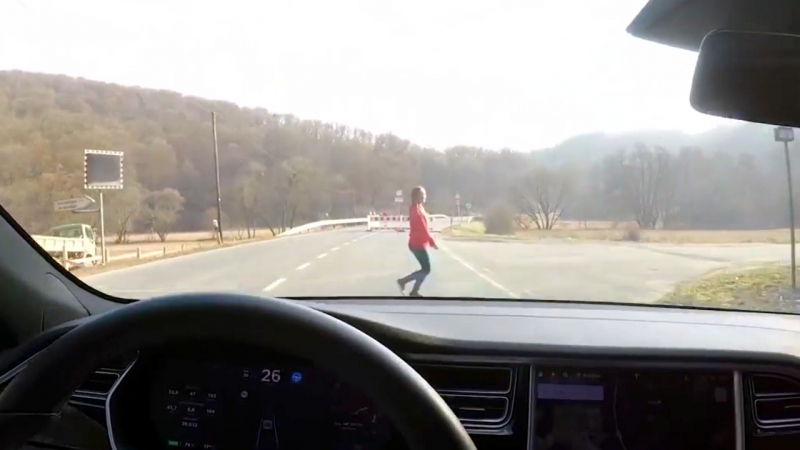 Mladá žena dostala za úkol přejít přes cestu, aby nasimulovala náhlou přítomnost chodce na cestě. Manžel se pak rozjel a se zapnutým autopilotem a čekal, co systém provede s detekovanou siluetou lidské postavy na silnici. Elektromobil zpočátku klidně pokračoval v jízdě, až najednou vydal zvukovou výstrahu panickým pípáním a skutečně prudce zabrzdil. I tak mladá dáma intuitivně uskočila bokem.