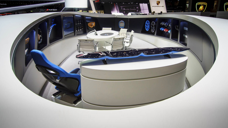 Stánek Bugatti tak nedefinují jen strohé čtyři stěny, jako je tomu u většiny ostatních. Místo toho působí jako designové studio, jež je k dispozici zákazníkům v ústředí firmy ve francouzském Molsheimu. Kromě toho zde najdeme i strop, který všude jinde chybí. Navíc je prohnutý, takže světla na něm umístěná lépe nasvěcují vystavený Chiron.