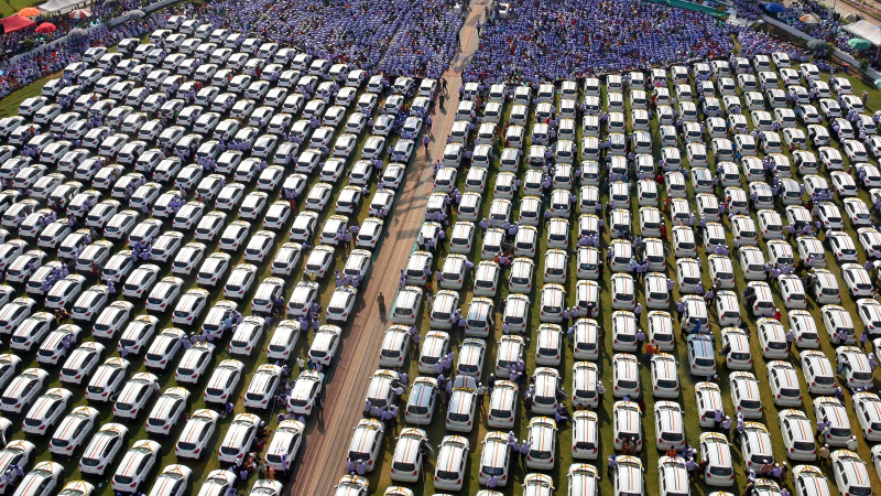 Vskutku pozoruhodné záběry nabízí snímky z akce, na které bylo zaměstnancům firmy Hari Krishna Exports předáno mimo jiné 600 nových aut