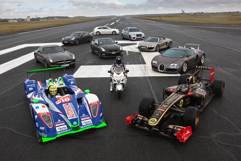 Francouzská redakce magazínu Sport auto se rozhodla nadělit svým čtenářům jako vánoční dárek právě srovnání rozličných superrychlých aut (my jsme přišli s testem Porsche 911 991 Carrera S, musíme se holt ještě snažit...) právě ve zrychlení z klidu na 300 km/h a to je něco, co se jen tak nevidí. Na dráze se totiž neobjevila jen auta, která lze ke srovnání získat ještě relativně snadno, ale i stroje, jenž sotva kdy spatříte mimo hranice závodních okruhů. Konkrétně se jednalo o Audi R8 V10 Spyder, BMW X6 M, Bugatti Veyron Grand Sport, Cadillac CTS-V Wagon, již zmíněnou F1 týmu Lotus Renault, Mercedes-Benz SLS AMG, Nissan GT-R, závoďák Pescarolo-Judd LMP1, Porsche Panamera Turbo S a z říše motocyklů Suzuki Hayabusa.