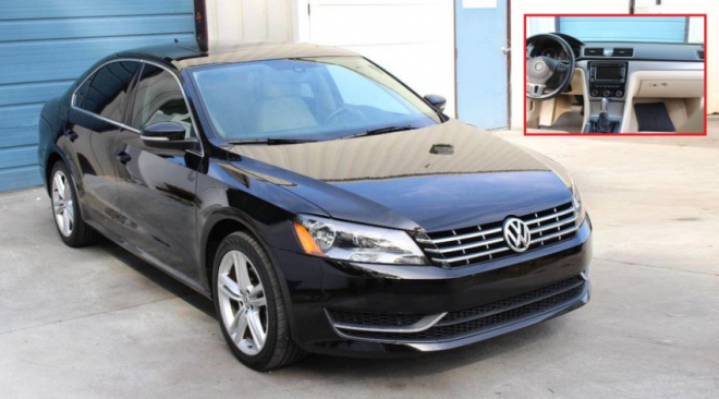 Ukážeme vám tři. První a zároveň nejlevnější kus je černý Passat SE s béžovým látkovým interiérem a dvoulitrovým TDI o 103 kW (140 koních) (ostatně, jiný „Clean Diesel” pro Passat v USA k dispozici nebyl). Nuzně vybaven přesto není, je tu HD rádio s dotykovou obrazovkou a Bluetooth, měnič CD, klimatizace, tempomat a alarm. Skoro samozřejmostí je v této třídě v USA automatické řazení. Je starý necelé dva roky, najel 112 tisíc kilometrů a je opravdu levný - stojí 8 800 Eur, tj. cca 239 tisíc korun.