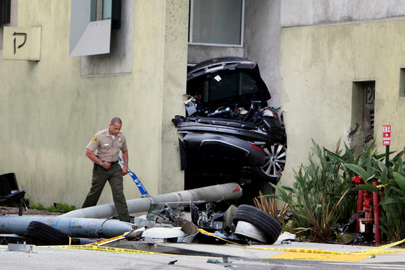 Stupiditu policejních honiček tentokrát necháme stranou - po nějaké době přišla křižovatka v Západním Hollywoodu, kde zloděj v Tesle S narazil do pouliční lampy a do třech dalších vozů. Teslu přitom rozpůlil - zadní část se zaklínila do vstupu místní synagogy, přední zůstala na silnici a začala hořet, stejně jako mnoho úlomků, ležících na silnici. Zloděj utrpěl vážná zranění, stejně jako tři lidé z vozů, do kterých naboural. Zbývající dva hospitalizovaní mají lehčí zranění. „Chtěli jsme pomoct, ale všude bylo příliš kouře a ohně,” řekl televizi NBC LA očitý svědek.