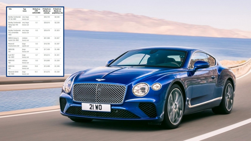 Smutným králem této statistiky za rok 2017 je Bentley Continental GT, který zrovna loni dorazil ve své nové generaci. Stojí od asi 4,5 milionu Kč a podle IIHS v jeho případě připadá přes 7 nehod na „100 pojištěných autoroků”. To je ještě průměrné číslo, výše škod na jednu nehodu ale se 35 744 dolary (759 500 Kč) průměr sedminásobně překračuje. A tak je výsledkem průměrná škoda na jeden pojištěný vůz 2 536 dolarů (53 900 Kč) na rok. A pak se divte, že pojistit tahle auta snadno stojí šestimístnou částku každých 12 měsíců...